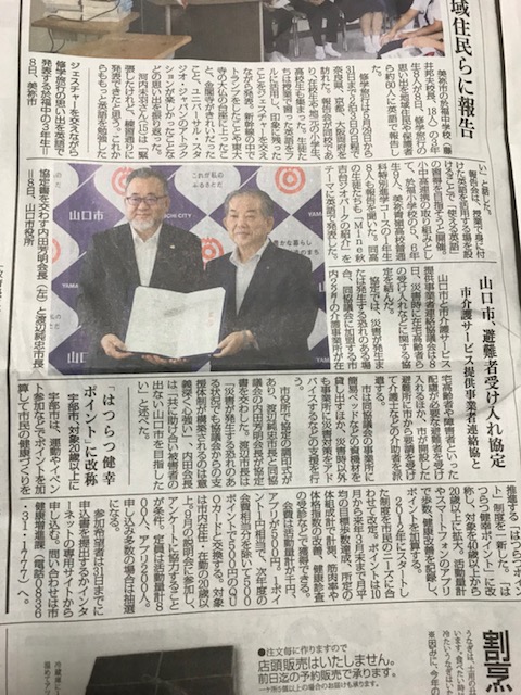 山口市と山口市介護サービス提供事業者連絡協議会(山介協)との間で災害協力協定が結ばれた。