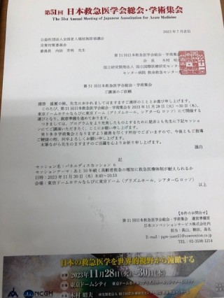 先般、第51回日本救急医療学会総会・学術集会より講演依頼の招聘状が届いた。